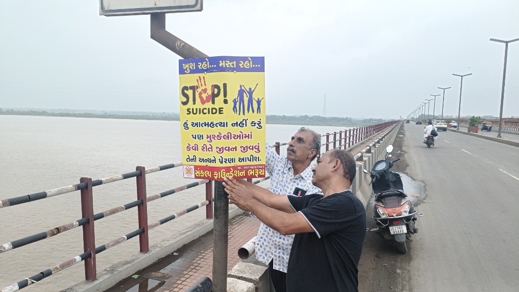 ભરૂચ – અંકલેશ્વરને જોડતા નર્મદા મૈયા બ્રિજ પરથી નદીમાં કૂદી આપઘાતના વધતા બનાવો રોકવા સંકલ્પ ફાઉન્ડેશન દ્વારા સમાજમાં જનજાગૃતિ ફેલાઈ તેવા ઉદ્દેશ્ય સાથે ખુશ રહો, મસ્ત રહો અને સ્ટોપ સ્યુસાઈડ લખેલા સાઈન બોર્ડ લગાવી આત્મહત્યાના બનાવો રોકવાના પ્રયાસો હાથ ધરાયા છે.