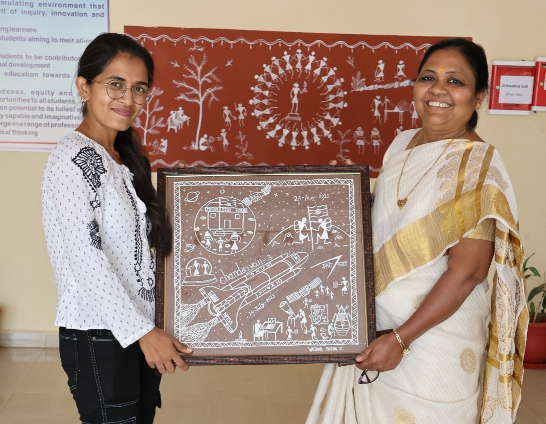 આ પેઈન્ટિંગમાં પરંપરાગત વારલી આર્ટ શૈલીનો ઉપયોગ કરી ચંદ્રયાન-3 મિશન અને ભારતના વૈજ્ઞાનિક પ્રયાસોને પ્રતિબિંબિત કરવામાં આવ્યું છે. ખાસિયત એ છે કે આ કલા કૃતિ કૅનવાસ બોર્ડ પર ગોબરથી લીપેલી અને રંગોની જગ્યાએ ચોખાના લોટ વડે તૈયાર કરવામાં આવી છે,જે તેને અનોખી અને સર્જનાત્મક બનાવે છે.આ કૃતિ પરંપરાગત કલા અને આધુનિક અંતરિક્ષ વિજ્ઞાનના સંયોજનનું સુંદર પ્રતિનિધિત્વ કરે છે.કોલેજના પ્રિન્સિપાલ અને સ્ટાફ દ્વારા સ્નેહાબેન વસાવાને આ વિશેષ સિદ્ધિ બદલ હાર્દિક અભિનંદન પાઠવ્યા હતા.