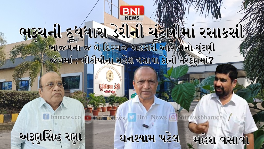 ભરૂચની દૂધધારા ડેરીની વ્યવસ્થાપન કમિટીની રસાકસી ભરેલ ચૂંટણીમાં એક બેઠક બિનહરીફ થયા બાદ ફોર્મ ખેંચવાના અંતિમ દિને પણ ભાજપના ઘનશ્યામ પટેલ અને અરૂણસિંહ રણા બંને અગ્રણીઓની પેનલ વચ્ચેનો જંગ નિશ્ચિત થયો છે.તો પૂર્વ ધારાસભ્ય મહેશ વસાવાએ જીતના વિશ્વાસ વ્યક્ત કરવા સાથે વર્તમાન ચેરમેન ઘનશ્યામ પટેલને સમર્થન હોવાનું પણ કહ્યું હતું.