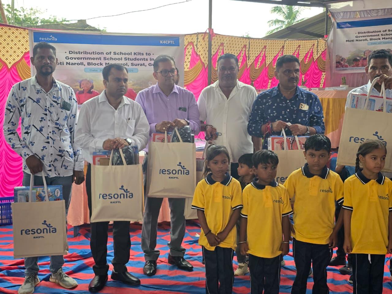સુરત જિલ્લાના મોટી નરોલી ગામ ખાતે ખાવડા ટ્રાન્સમિશન લાઈન (રિસોનીયા) અને દીપક ફાઉન્ડેશનના સહયોગથી વિદ્યાર્થીઓને સ્કુલ બેગ, યુનિફોર્મ,સ્ટડી ટેબલ વગેરે કીટનું વિતરણ કરવામાં આવ્યું હતું.