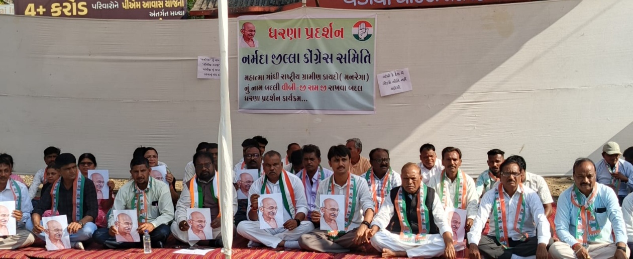 રોહિતભાઈ પટેલ, ઉપપ્રમુખ, નર્મદા જિલ્લામાલવ બારોટ, ઉપપ્રમુખ, નર્મદા જિલ્લા ના ડો. કમલભાઈ ચૌહાણ, પ્રમુખ, રાજપીપળા શહેર કોંગ્રેસ, વાસુદેવભાઈ વસાવા, જિલ્લા પ્રમુખ,વગેરે આગેવાનો કાર્યકરોએ ધરણા પ્રદર્શન કરી સૂત્રોચ્ચાર કરી ભાજપા સરકાર નામહાત્મા ગાંધી રાષ્ટ્રીય ગ્રામીણ રોજગાર ગેરંટી અધિનિયમ) નું નામ બદલીનેવિકસિત ભારત ગેરંટી ફોર રોજગાર એન્ડ આજીવિકા મિશન (ગ્રામીણ) 2025′ એટલે કે ‘VB-G RAM G’ (જી રામ જી) રાખવામાં આવ્યું છેજેનો નર્મદા કોંગ્રેસે વિરોધ કર્યો હતો.