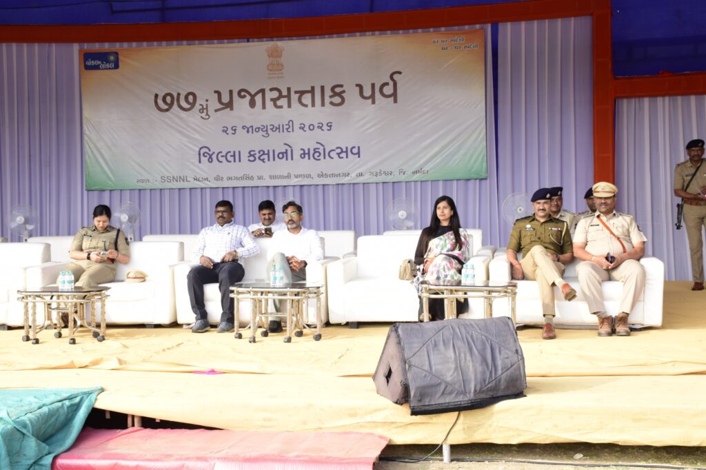 ભારતના ૭૭મા પ્રજાસત્તાક પર્વ ૨૬ મી જાન્યુઆરીએ નર્મદા જિલ્લાકક્ષાની ઉજવણી ગરૂડેશ્વર તાલુકાના SSNNL ગ્રાઉન્ડ-એકતાનગર ખાતે સોમવારે સવારે ૯ કલાકે યોજાશે. ગુજરાત સરકારના પાણી પુરવઠા અને જળસંપત્તિ વિભાગના રાજ્યમંત્રી અને જિલ્લા પ્રભારી મંત્રી ઈશ્વરસિંહ પટેલ રાષ્ટ્રધ્વજ લહેરાવી તિરંગાને સલામી આપશે. તે પૂર્વે આજે શનિવારના રોજ જિલ્લા પોલીસ અધિક્ષક વિશાખા ડબરાલની ઉપસ્થિતિમાં પૂર્ણ ગણવેશ રિહર્સલ યોજાયું હતું.વહીવટી તંત્ર દ્વારા જાહેર જનતા પણ આ કાર્યક્રમમાં સહભાગી બને તેવી અપીલ કરવામાં આવી હતી.