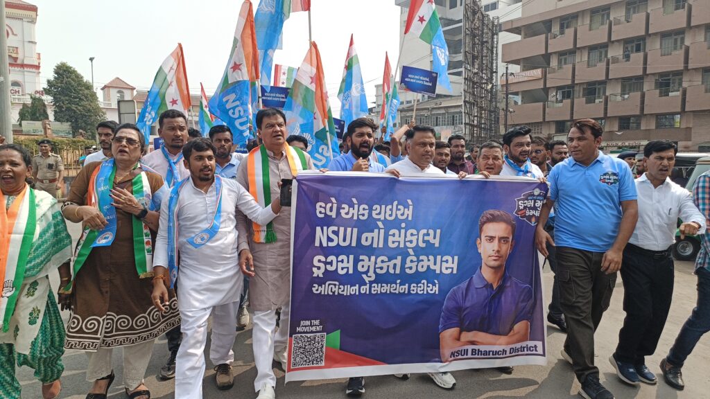 ગુજરાત પ્રદેશ NSUI દ્વારા “ડ્રગ્સ મુક્ત કેમ્પસ” અભિયાન અંતર્ગત ભરૂચમાં આજે વિરોધ રેલી યોજાતા મોટી સંખ્યામાં કાર્યકરો જોડાયા હતા.રેલી કલેક્ટર કચેરી પહોંચે તે પહેલા જ પોલીસે આગેવાનોની અટકાયત કરી હતી.