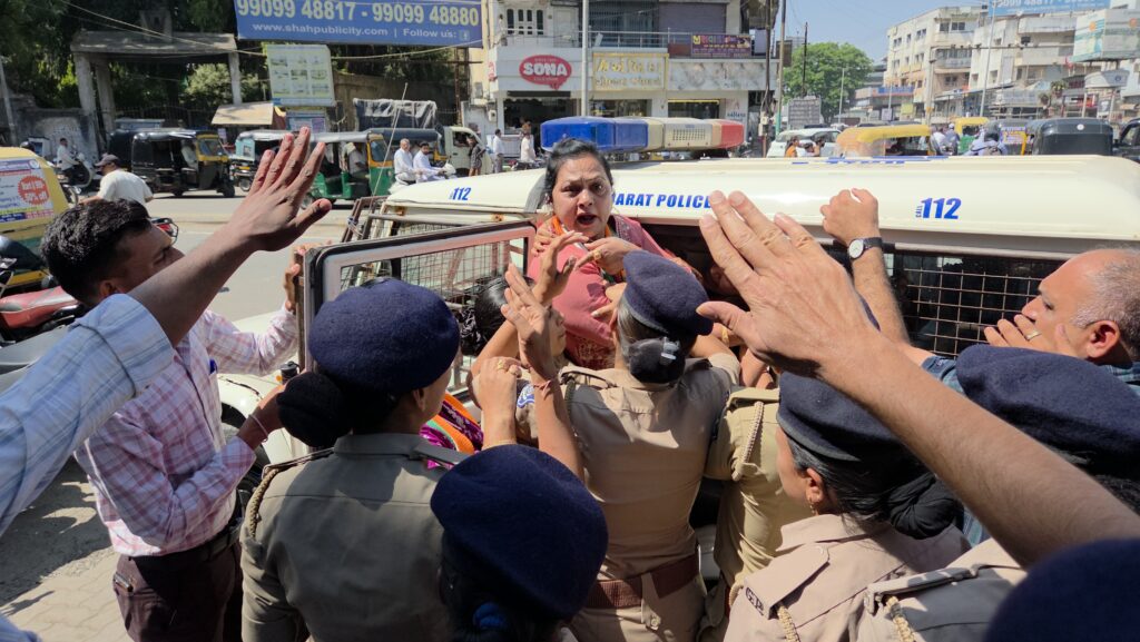 – મહિલા પ્રમુખને જબરજસ્તી પોલીસવાનમાં બેસાડતા તું તું મેં મેં ના દ્રશ્યો